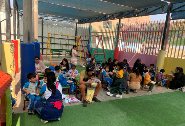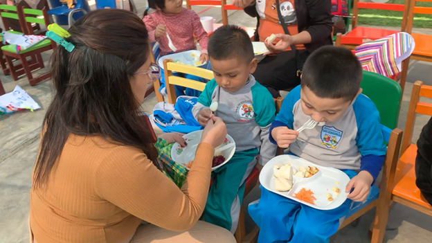 También este proyecto está bajo el enfoque de inclusión social, por lo cual, no se genera diferencias entre sus participantes. Una de sus participantes, la IEI “Las Abejitas” con sus 36 niños y niñas atendidos en sus 2 secciones, realiza los mismos esfuerzos para lograr el objetivo común: reducir y prevenir el sobrepeso y obesidad en los preescolares. Aquí el desarrollo de los ejercicios físicos dirigidos por las maestras, el desarrollo de los Salad bar y el uso de los platos saludables son ejecutados con la misma intensidad y compromiso como en las otras instituciones de mayor tamaño, lo que muestra su compromiso por el bienestar de sus niños y niñas. “En nuestra institución lo estamos implementando de manera activa, realizamos diariamente los ejercicios durante 5 minutos antes de iniciar las clases, que ayuda a que los niños empiecen el día con energía y motivación…” nos dice la profesora Rocío Maribel Tinoco Gómez, directora de la IEI.